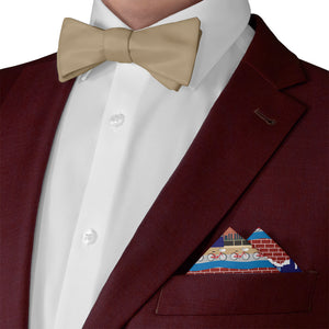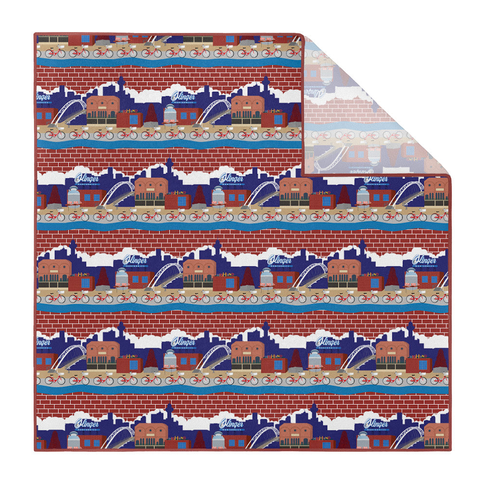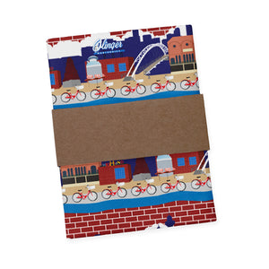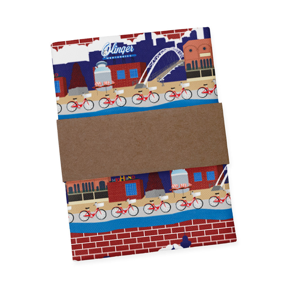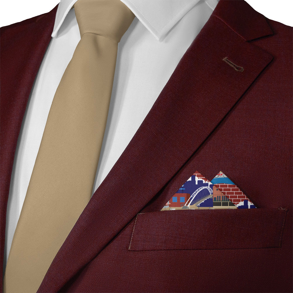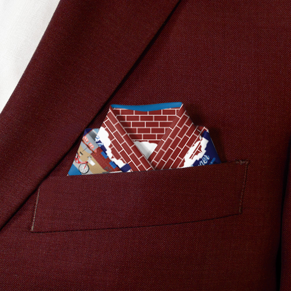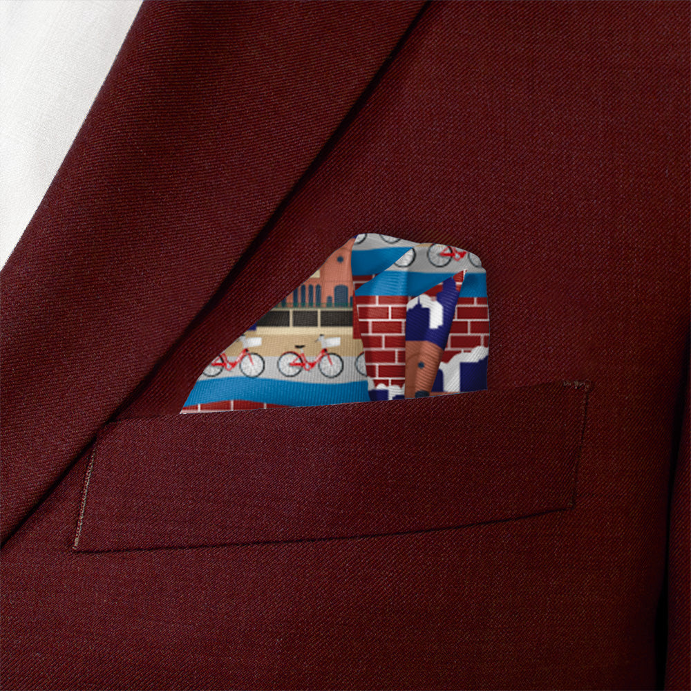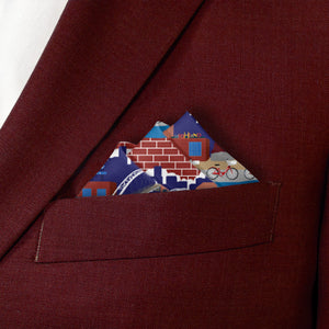 This pocket square design shows several of the many notable landmarks that contribute to the atmosphere that makes Highland so distinct. This includes the Highland Pedestrian Bridge, Little Man Ice Cream, REI, the bike trail along the Platte, Linger, the "National Velvet" public art sculpture, and the iconic red rental bikes. Now you can wear the Highland experience.