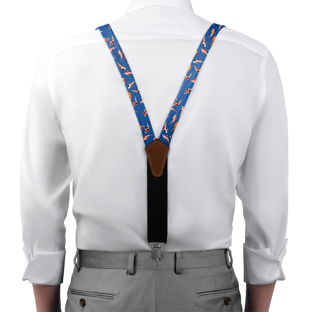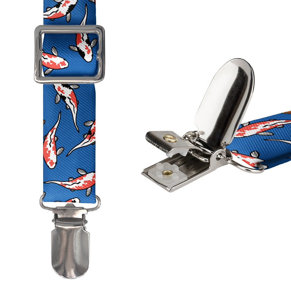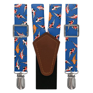 Colorful koi fish swim across the surface of these captivating suspenders. Bright splashes of color and a sense of movement give the design a pleasing composition. The whimsical Koi Fish suspenders are fantastic for summer.