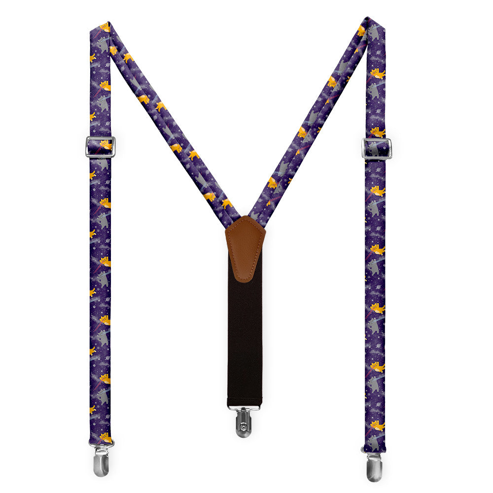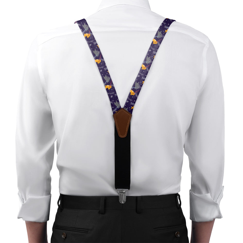 Printed fabric straps are 1-inch wide and secured to an elastic rear strap with vegan leather Y-back to allow the suspenders to move with you and extend as you bend. We use silver alligator pant clips that feature a special mechanism to ensure the suspenders clamp securely to pants.
