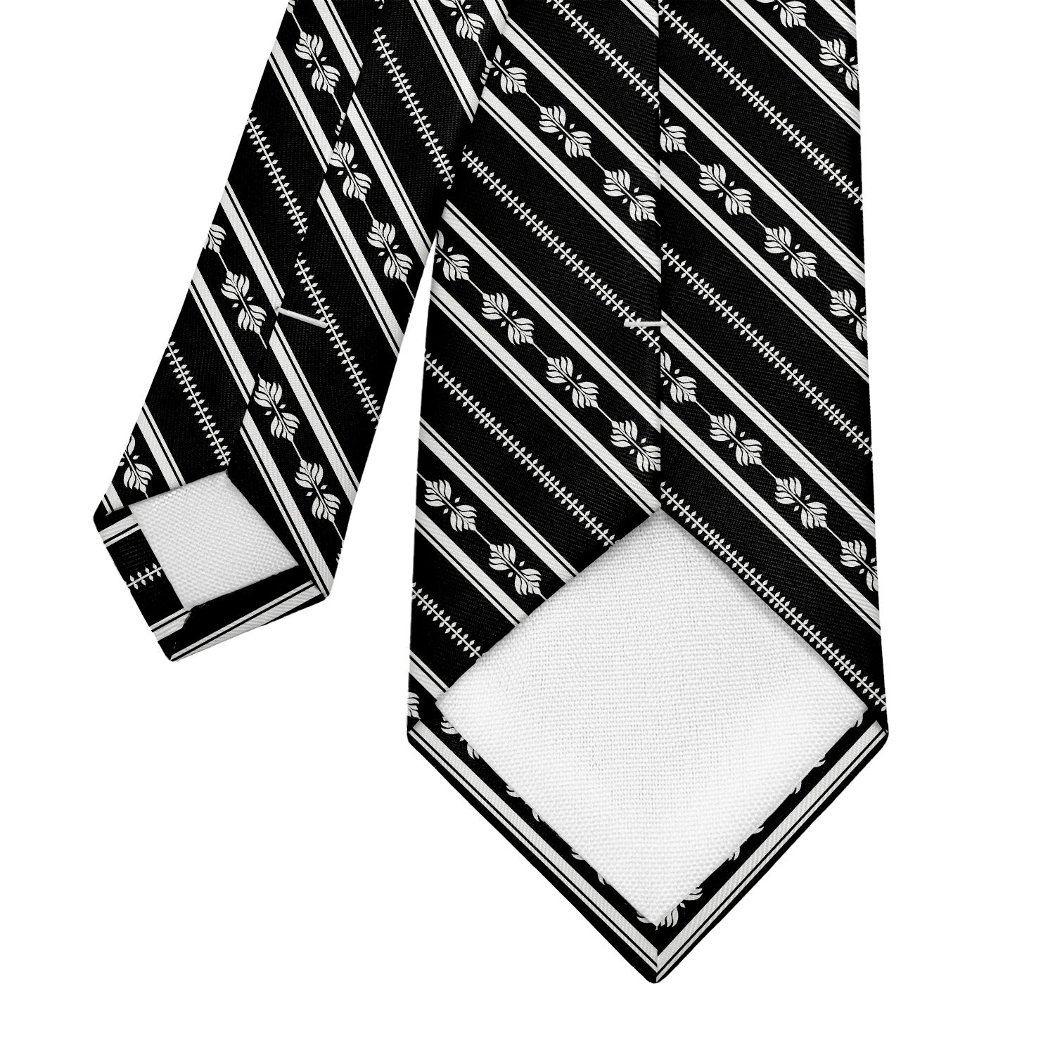 Laurel Stripe Necktie features diagonal striped bands paired with repeating laurel leaf motifs arranged in continuous rows. The small leaf elements run in straight lines between double striped bands, creating a consistent alternating stripe pattern across the tie. This laurel stripe pattern combines classic diagonal stripes with detailed leaf motifs for a distinctive patterned necktie suited for business and formal wear.