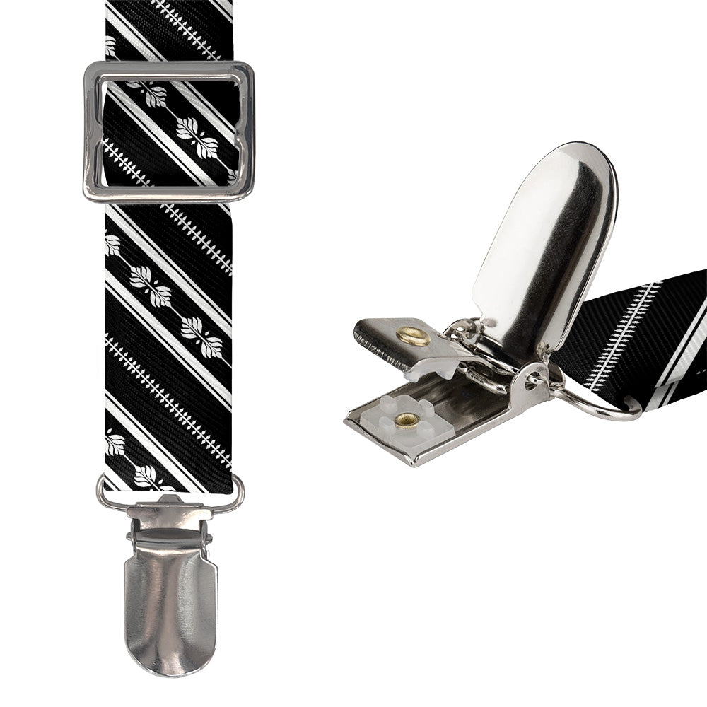 Laurel Stripe Suspenders feature diagonal striped bands paired with repeating laurel leaf motifs arranged in continuous rows. The small leaf elements run in straight lines between double striped bands, creating a consistent alternating stripe pattern throughout. This laurel stripe design combines classic diagonal stripes with detailed leaf accents for a sophisticated accessory suited for business and formal occasions.