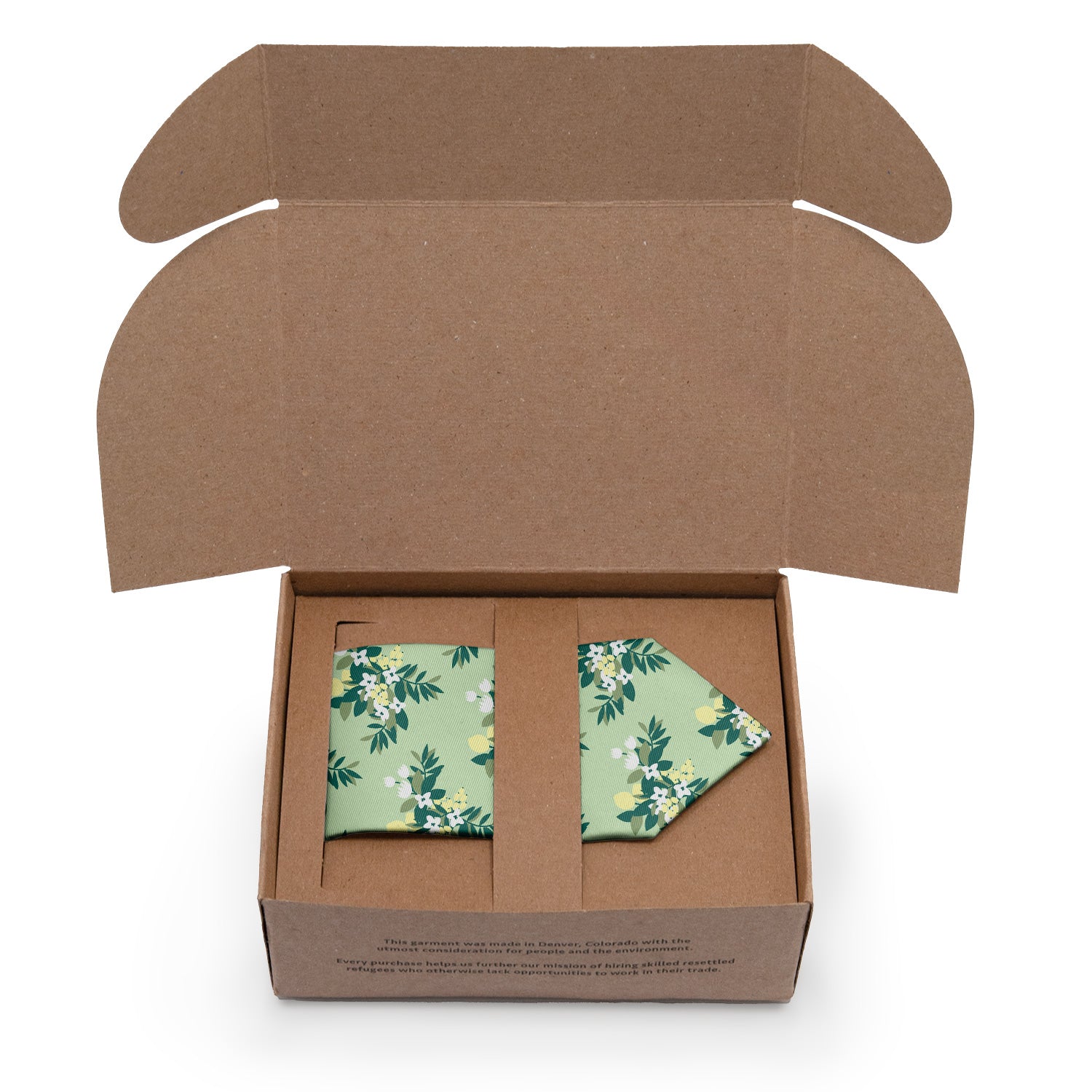 In the language of flowers, the lemon blossom symbolizes discretion. That's a fun fact to share when someone inevitably compliments this tie! Discreet or not, these cheerful lemon blossom sprays will surely earn a smile -- especially when you share that Knotty Tie was founded to give displaced refugees in Denver a fair price for their sewing skills.