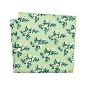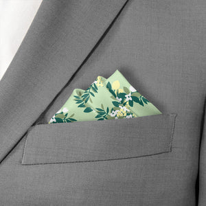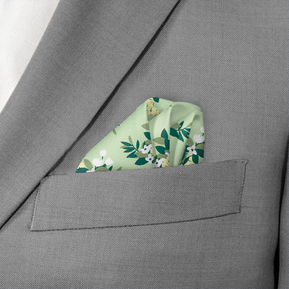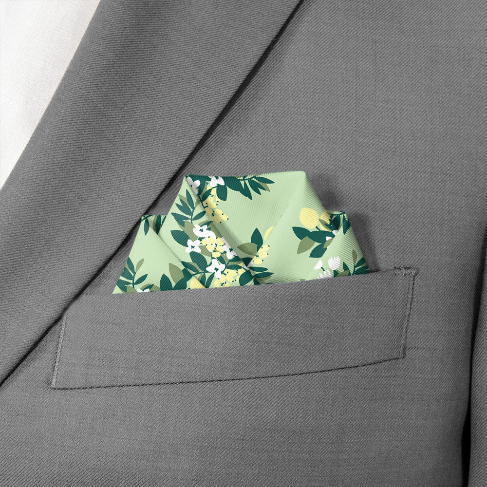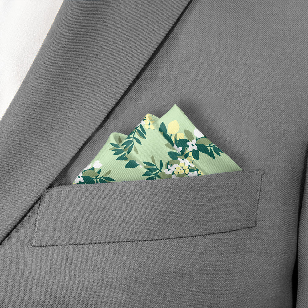 A two-point fold will show off the cheerful pattern and bright color of the Lemon Blossom pocket square. For a casual springtime look, wear it with white pants and a brown or gray blazer, minus the tie.