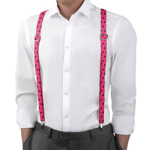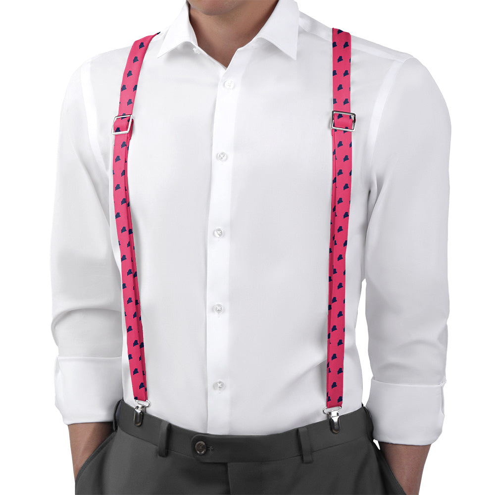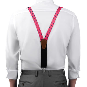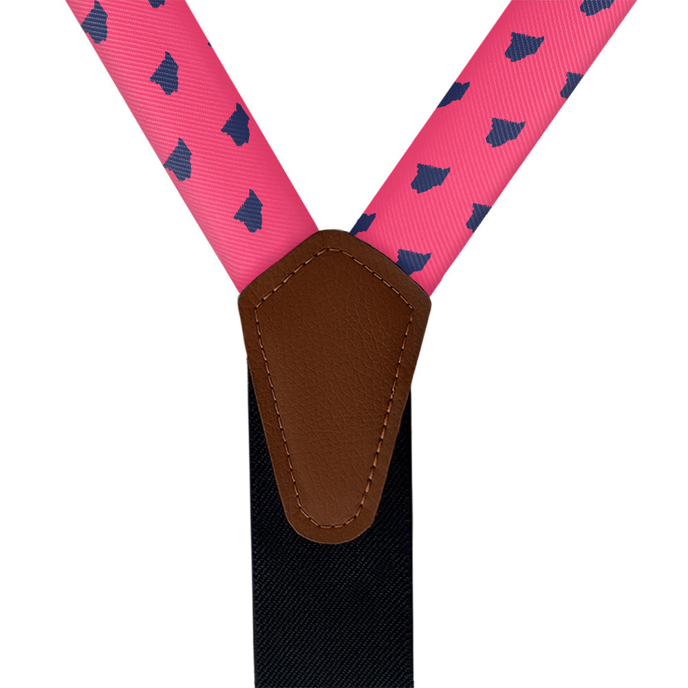 Printed fabric straps are 1-inch wide and secured to an elastic rear strap with vegan leather Y-back to allow the suspenders to move with you and extend as you bend. We use silver alligator pant clips that feature a special mechanism to ensure the suspenders clamp securely to pants.