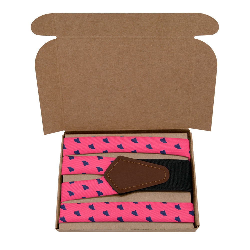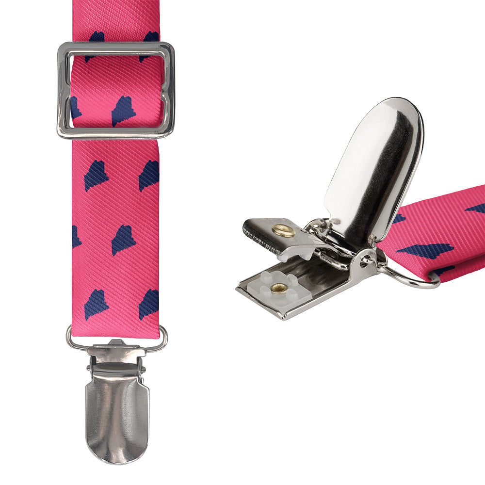 Show the world that you're a Mainer with the Maine State Outline suspenders. These customizable suspenders features a repeating outline of the state of Maine.