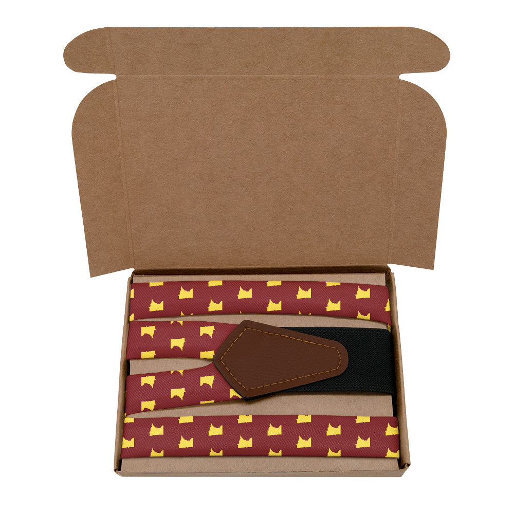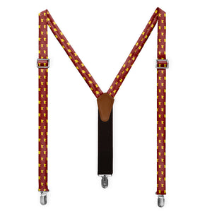 Printed fabric straps are 1-inch wide and secured to an elastic rear strap with vegan leather Y-back to allow the suspenders to move with you and extend as you bend. We use silver alligator pant clips that feature a special mechanism to ensure the suspenders clamp securely to pants.
