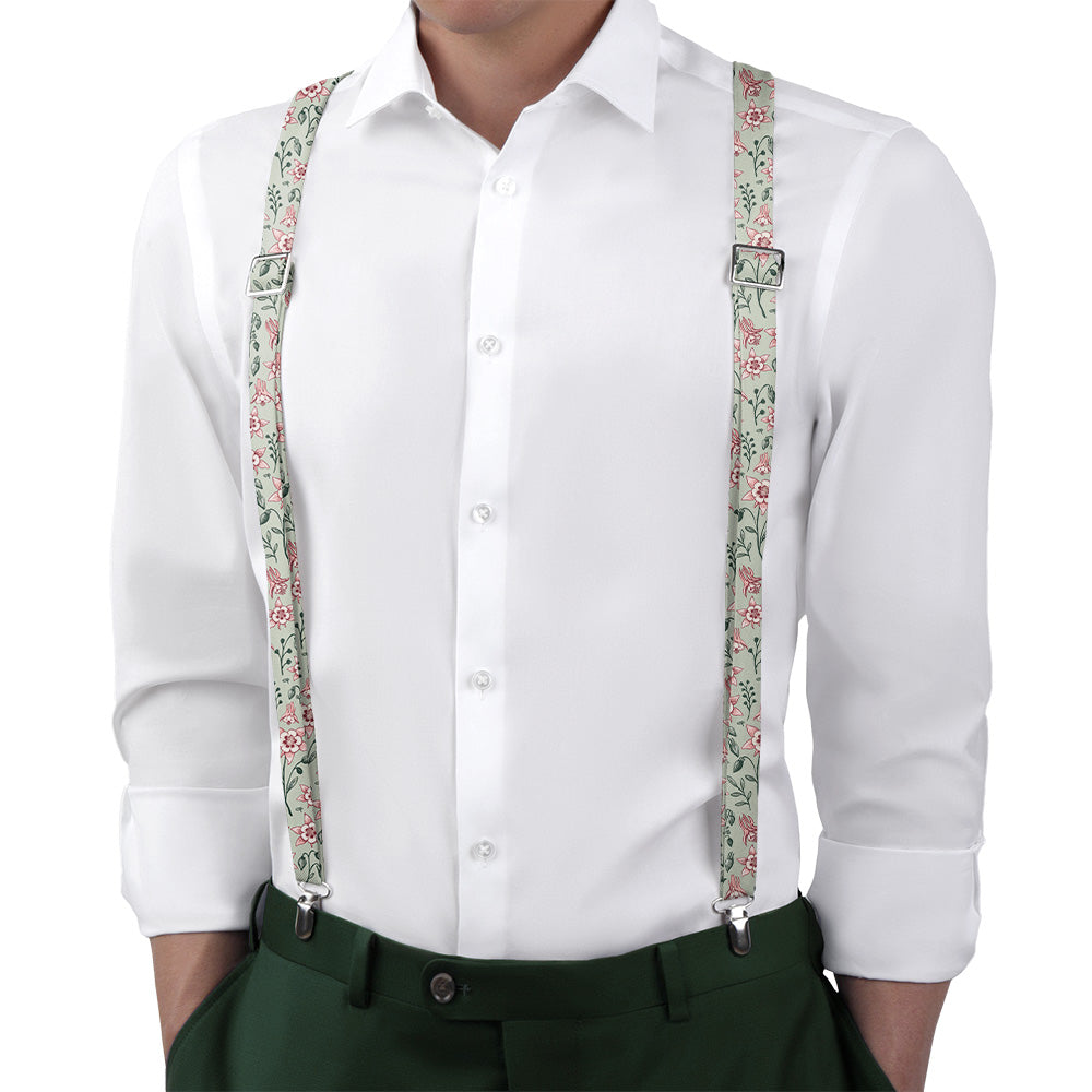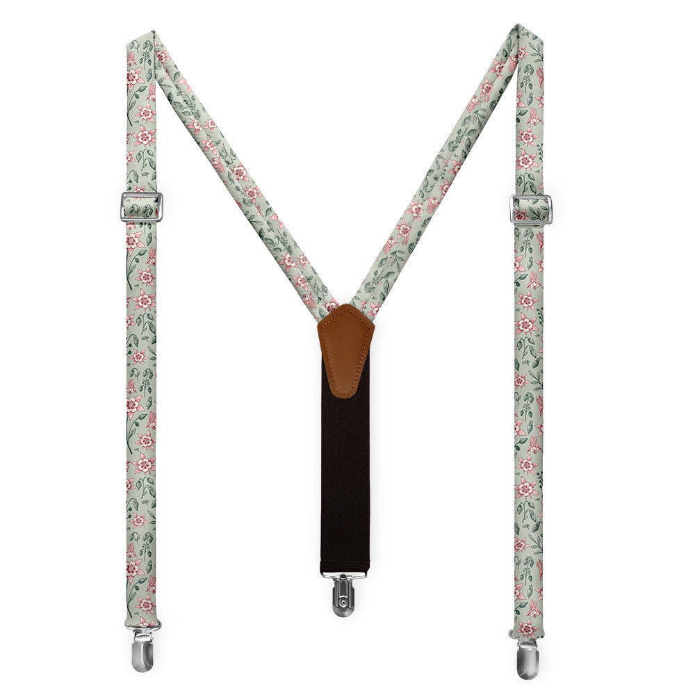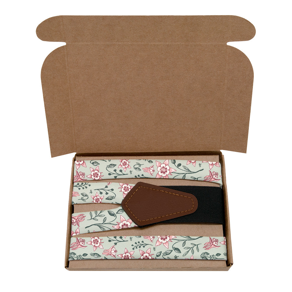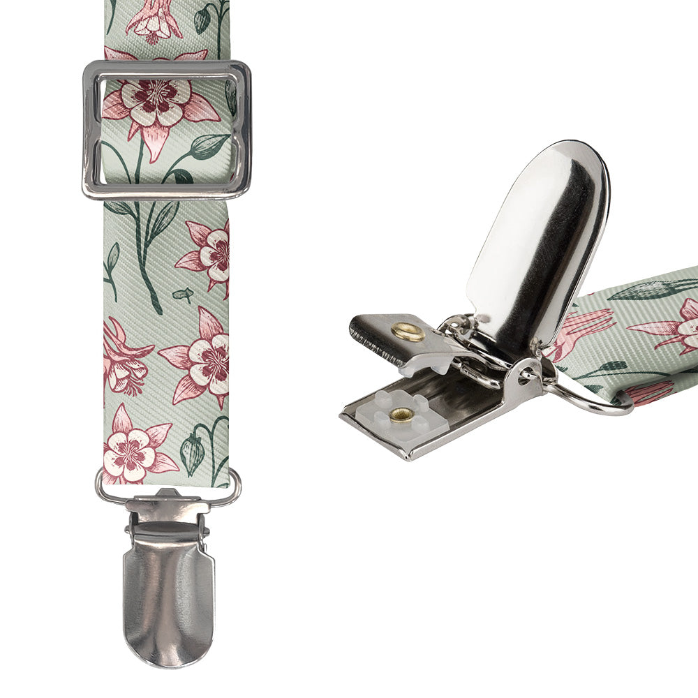 Mountain Columbine suspenders features a lively hand-drawn floral print inspired by the alpine wildflower of the same name. With its whimsical blooms and botanical details, this design brings a fresh, outdoorsy charm to your ensemble. Perfect for weddings, spring events, or anyone who loves nature-inspired style with a playful twist.