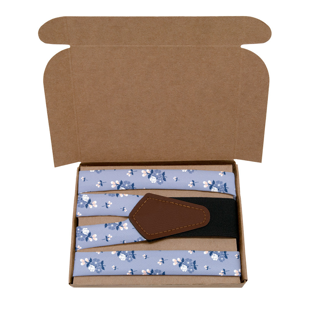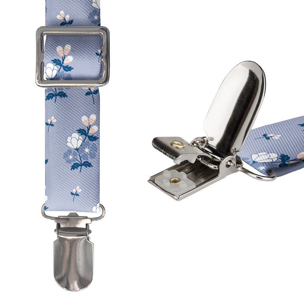 Printed fabric straps are 1-inch wide and secured to an elastic rear strap with vegan leather Y-back to allow the suspenders to move with you and extend as you bend. We use silver alligator pant clips that feature a special mechanism to ensure the suspenders clamp securely to pants.