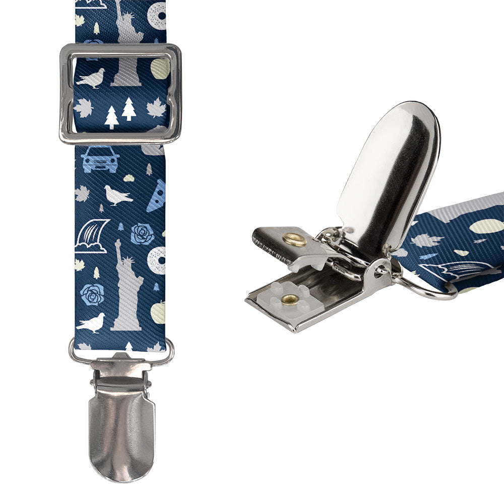 New Yorkers can show their state pride with these suspenders honoring the Empire State. The New York State Heritage suspenders illustrate New York icons like the Statue of Liberty, Niagara Falls, pizza, bagels, taxi cabs, and more!