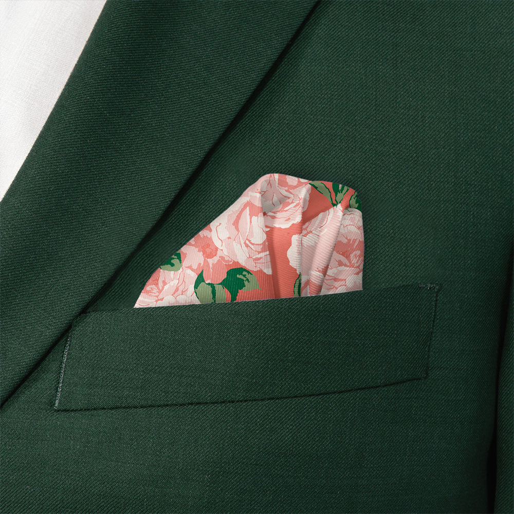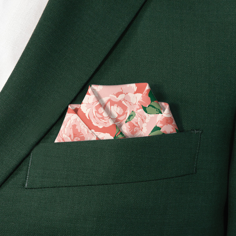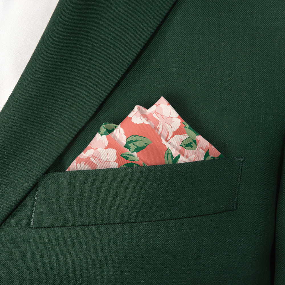 All peonies belong to the genus paeonia, so it's no surprise that our Paeonia pocket square is blooming with these showy blossoms. Luxurious and vibrant peonies dominate this large floral print pocket square.