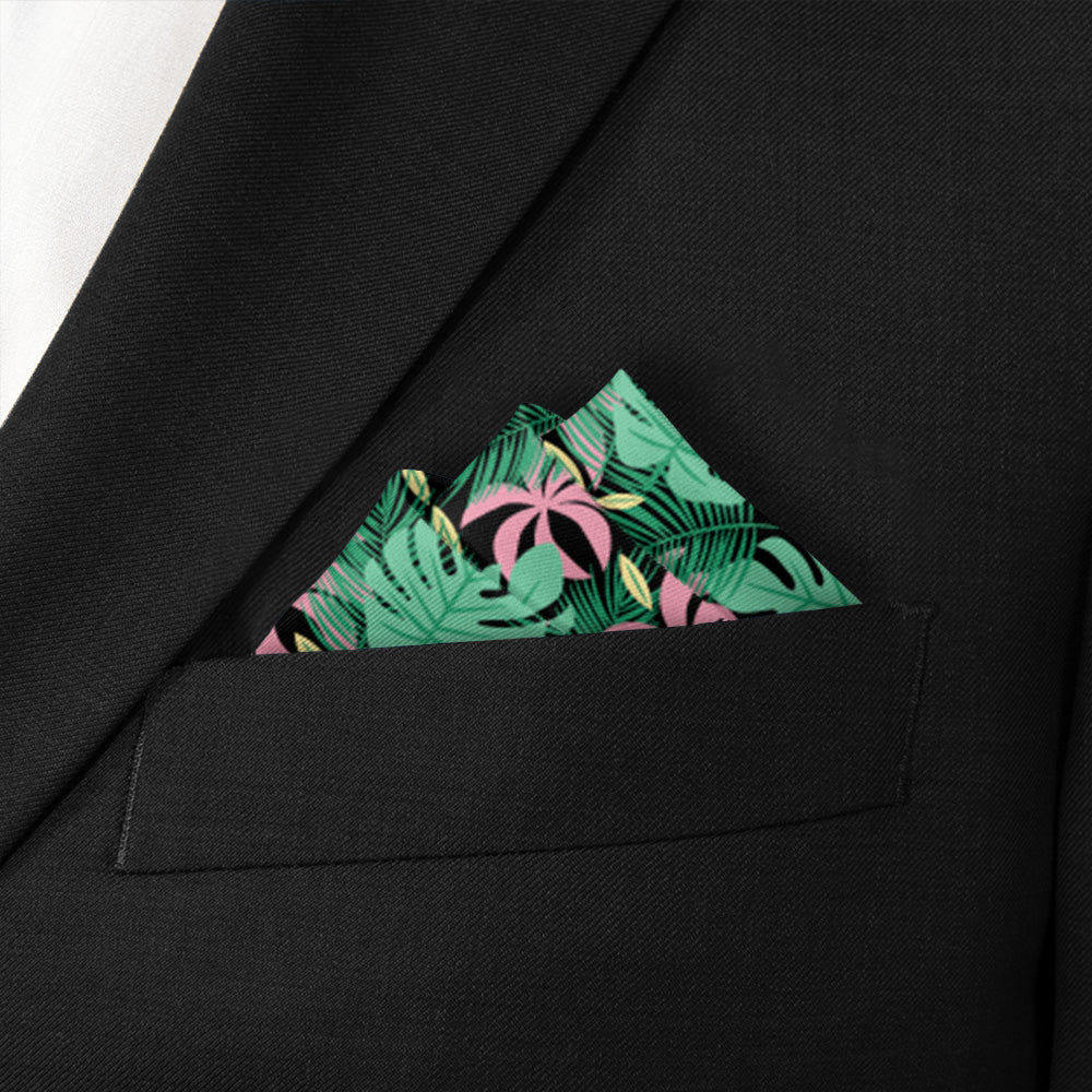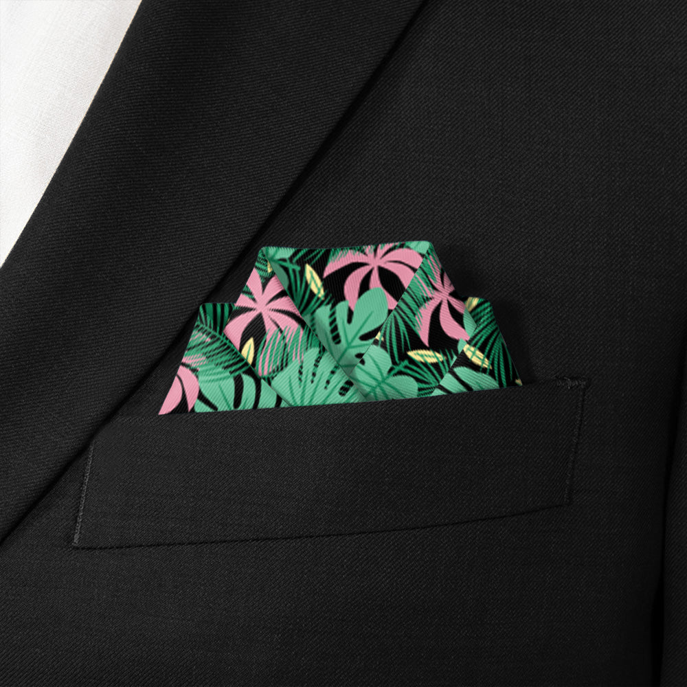 Add a touch of tropical flair to your outfit with our Paradise Palms pocket square. Featuring a vibrant palm and monstera print, this pocket square is ideal for any tropical occasion or destination wedding. Personalize the pattern's colors to reflect your own style or color scheme.