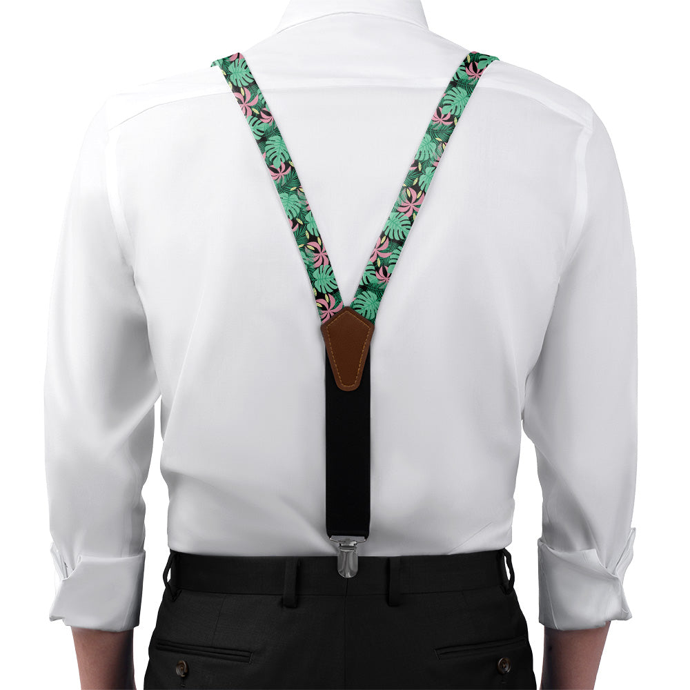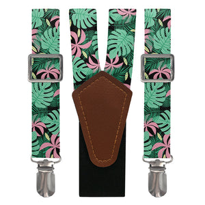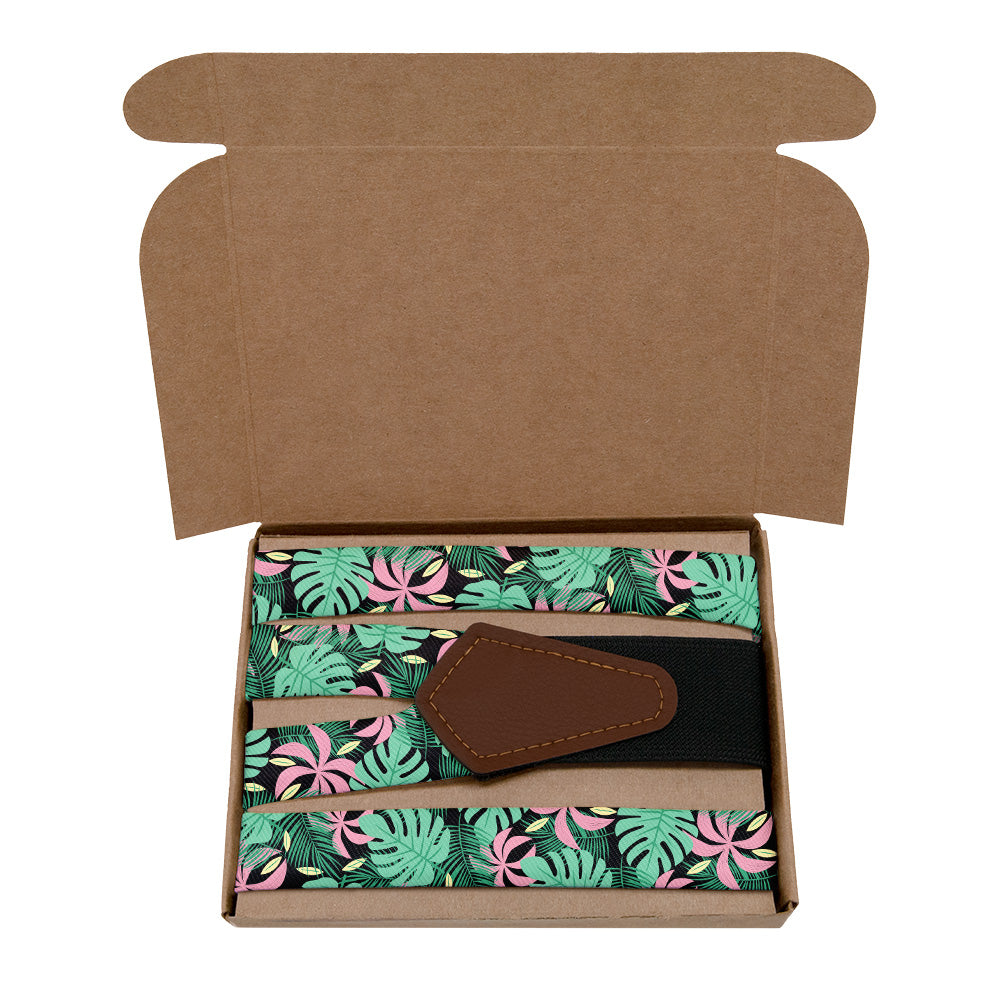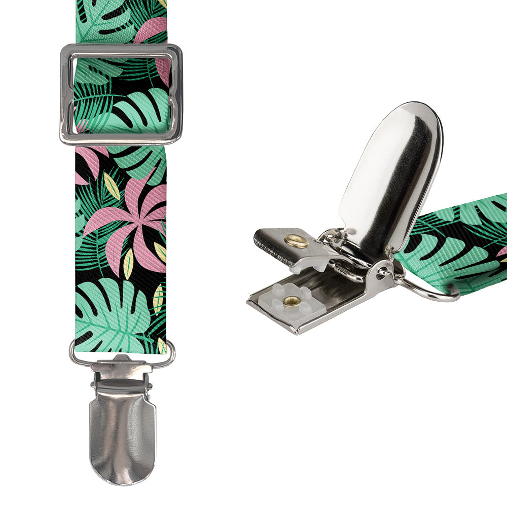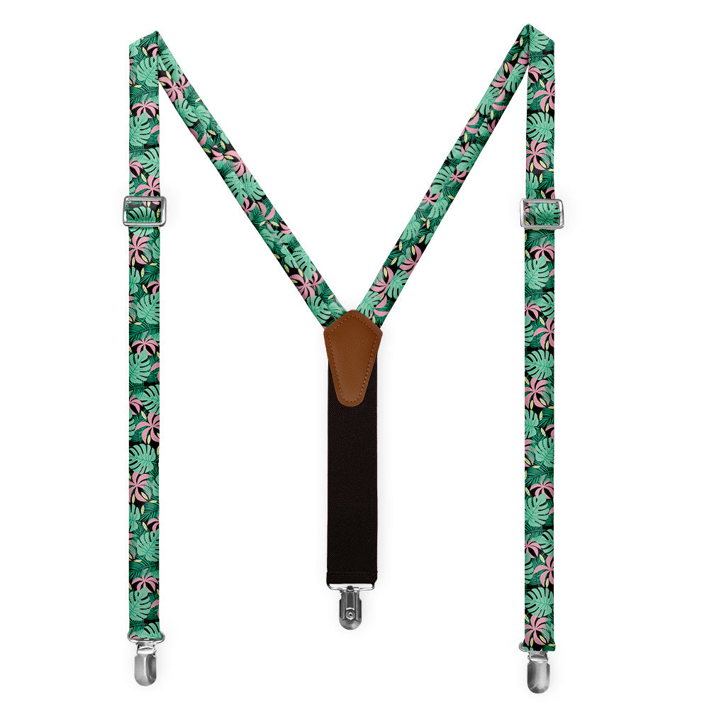 Add a touch of paradise to your wardrobe with our Paradise Palms suspenders. Featuring a vibrant tropical palm and monstera pattern, these suspenders suit any tropical-themed event or destination wedding. Make a statement by customizing the colors in this pattern to fit your aesthetic or color scheme.