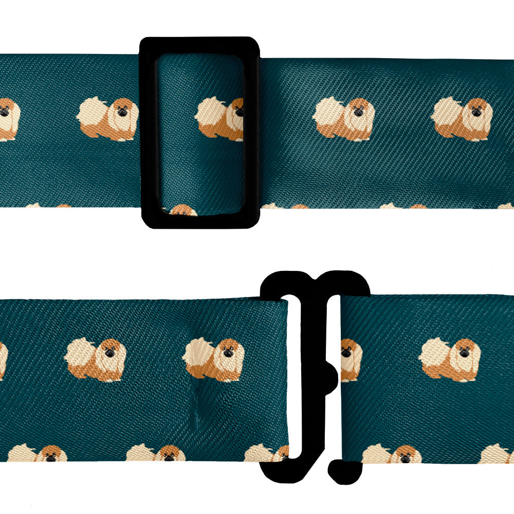 Flat faces, long fur, and a distinctive rolling gait make the Pekingese popular pets. The Pekingese bow tie highlights the fluffy tail and long skirt of these tiny dogs.