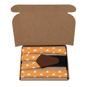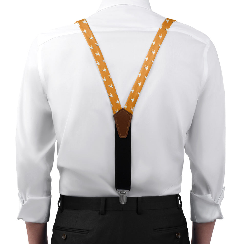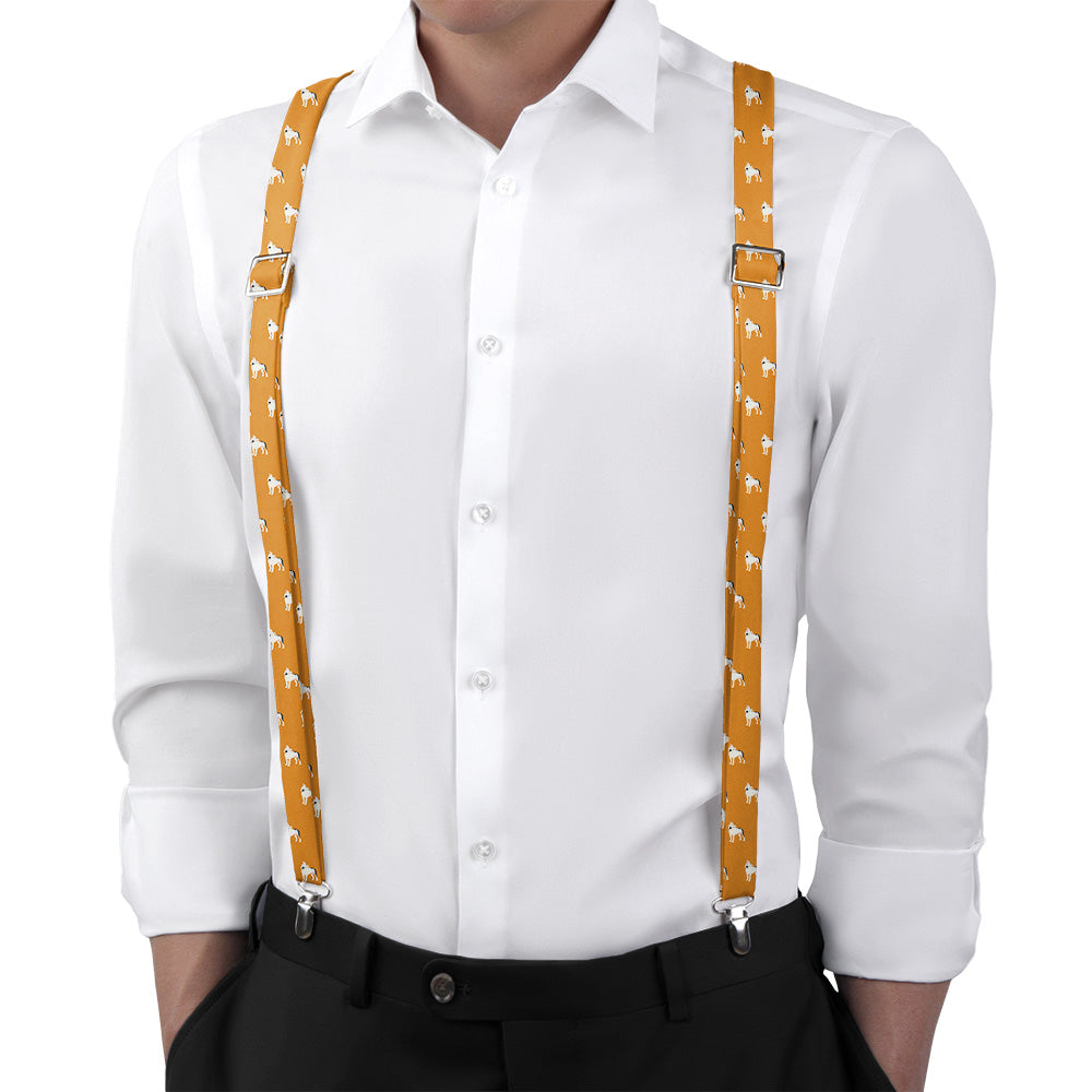 Printed fabric straps are 1-inch wide and secured to an elastic rear strap with vegan leather Y-back to allow the suspenders to move with you and extend as you bend. We use silver alligator pant clips that feature a special mechanism to ensure the suspenders clamp securely to pants.
