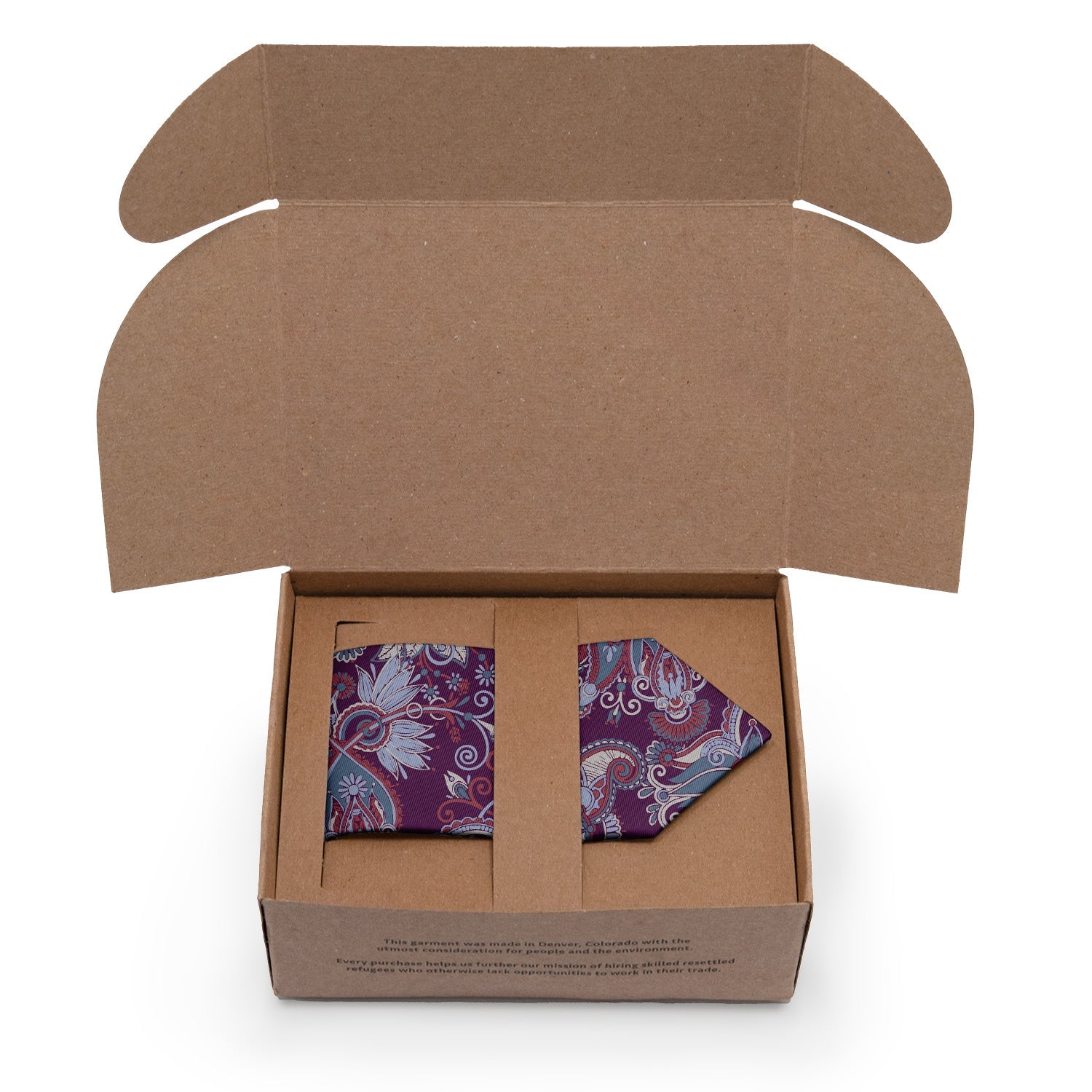 These sumptuous wedding ties embrace paisley's long association with the bohemian counterculture, with curling tendrils of vine, exuberant blossoms, and sprays of richly textured leaves. An ethical alternative to conventional neckties, these paisley ties were proudly crafted in Denver by a team of skilled resettled refugees.