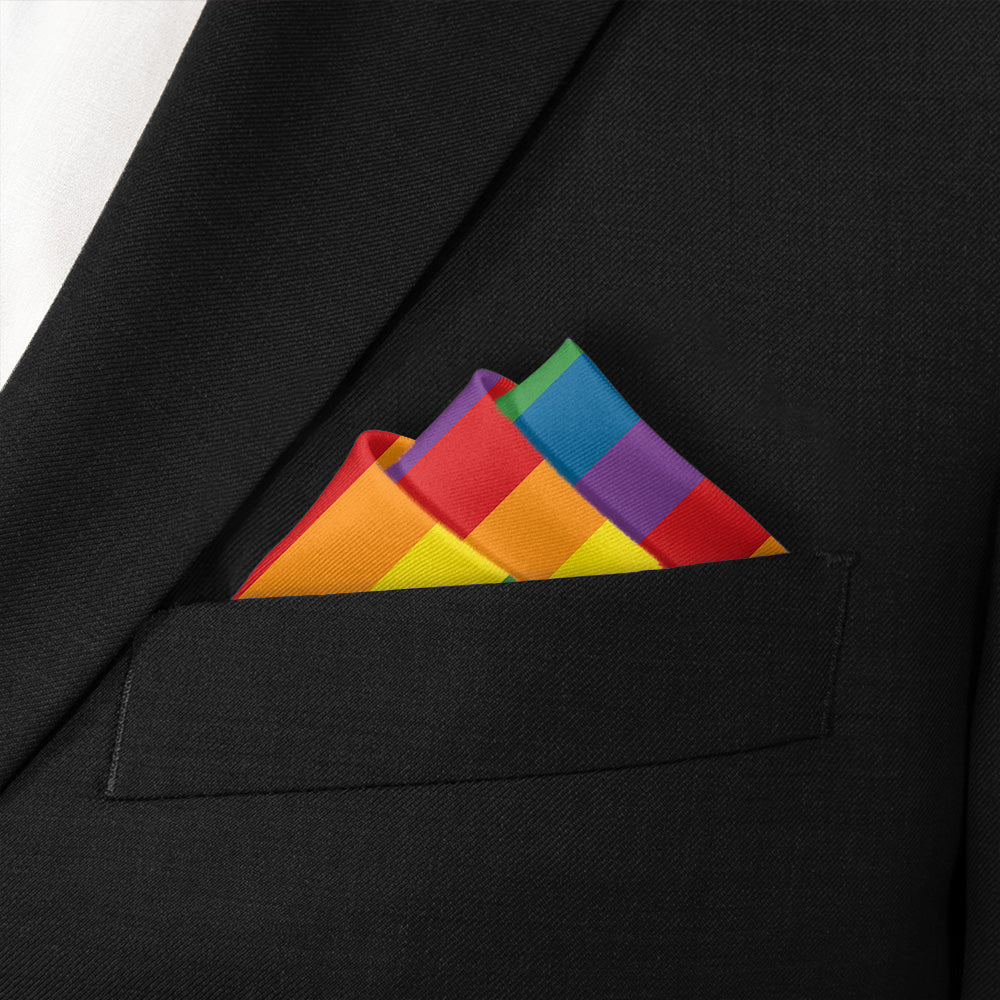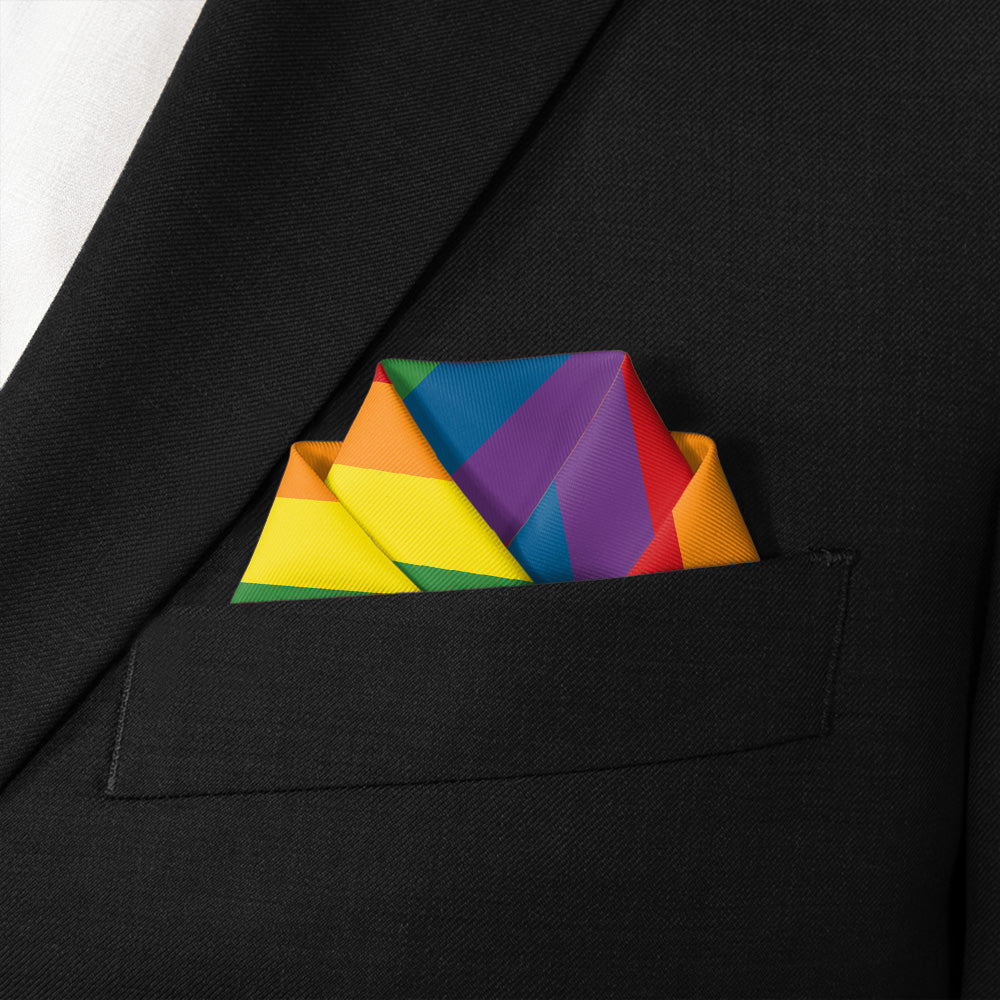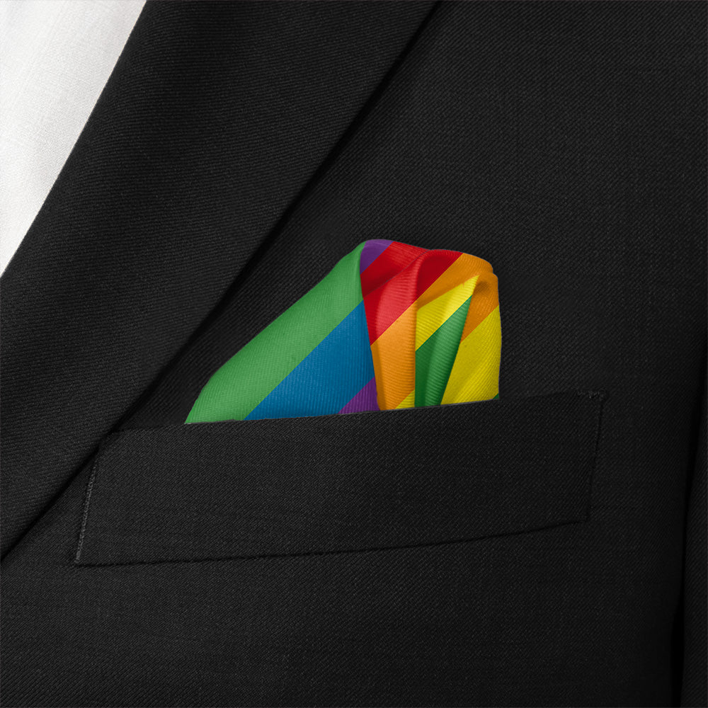 This Pride Flag pocket square is the perfect way to celebrate and show your support for the LGBTQ+ community in style. Featuring a timeless rainbow stripe pattern and vivid colors, this pocket square makes a statement without having to say a word.