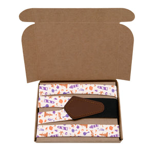The South Carolina State Heritage suspenders celebrate the Palmetto State. South Carolinians will recognize the icons on these suspenders, from the pineapple fountain at Joe Riley Waterfront Park, to the Peachoid Water Tower, to the Harbourtown Lighthouse.