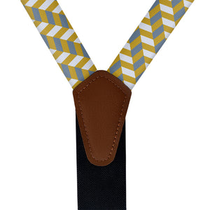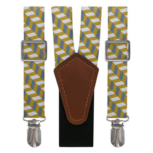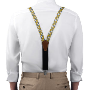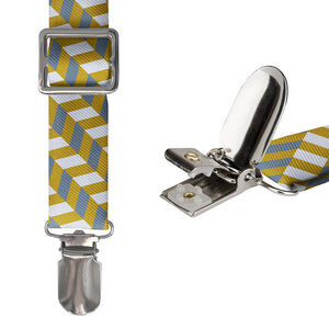 Printed fabric straps are 1-inch wide and secured to an elastic rear strap with vegan leather Y-back to allow the suspenders to move with you and extend as you bend. We use silver alligator pant clips that feature a special mechanism to ensure the suspenders clamp securely to pants.