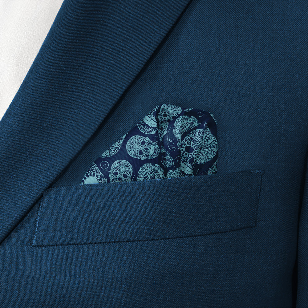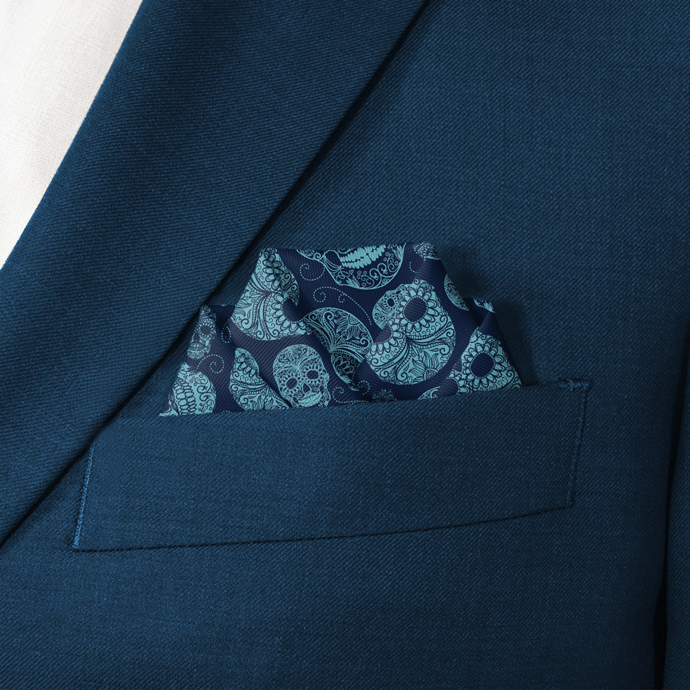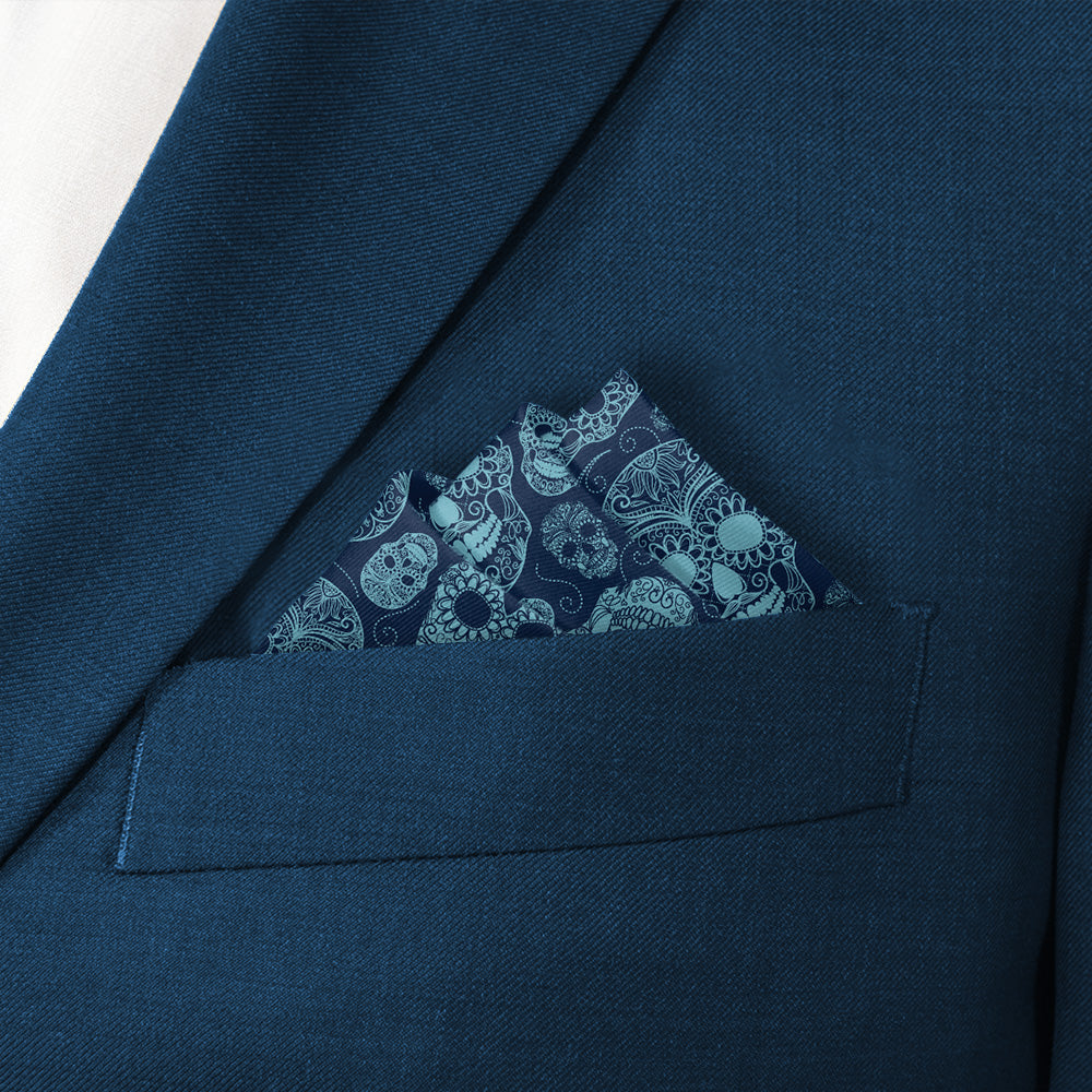 Grinning sugar skulls tumble across this Día de los Muertos pocket square. The simplicity of the 2-color design balances the ornately decorated skulls, making the Sugar Skull pocket square perfect for everyday wear and formal attire alike.
