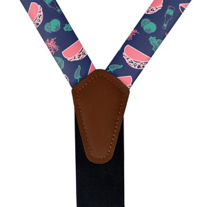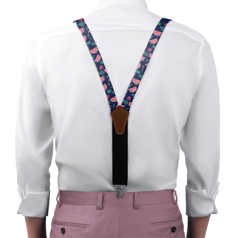 Printed fabric straps are 1-inch wide and secured to an elastic rear strap with vegan leather Y-back to allow the suspenders to move with you and extend as you bend. We use silver alligator pant clips that feature a special mechanism to ensure the suspenders clamp securely to pants.