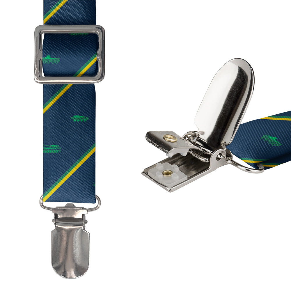 Bold stripes and small tank silhouettes give these Tank You suspenders a subtle touch of excitement. These military suspenders make a great gift for soldiers or tank enthusiasts.