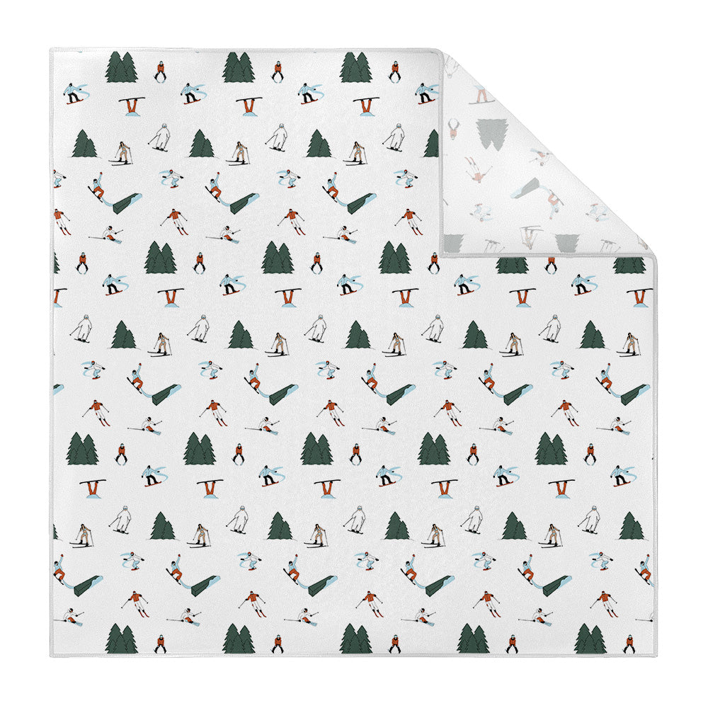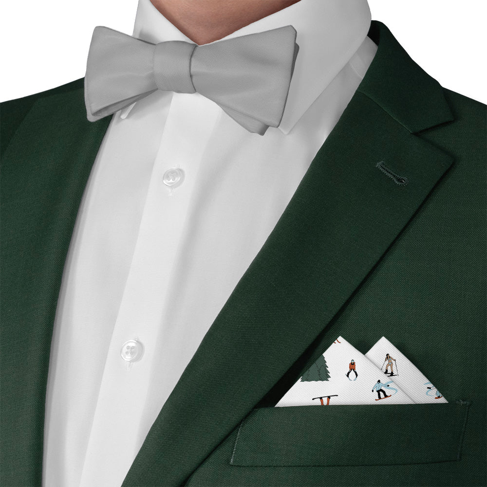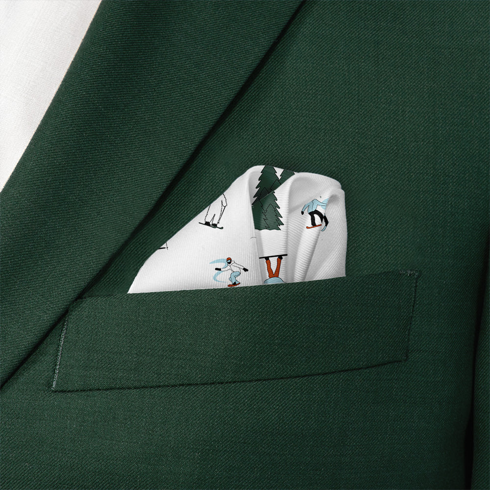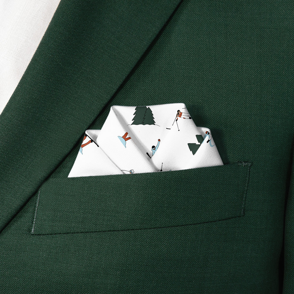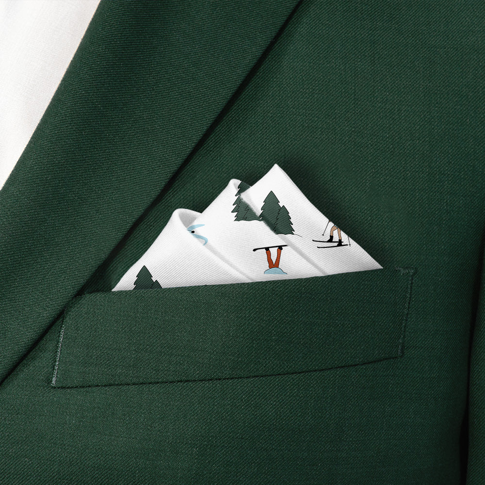 Design your own by changing the colors of the ski parkas, the trees, or even the snow! The Slopes pocket square is a stylish compliment to your favorite scarf.